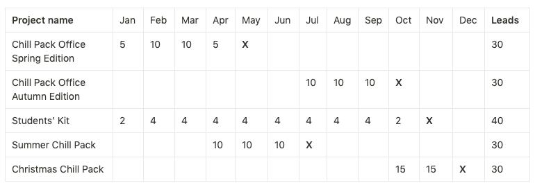 I go back to the table and allocate the 160 leads per projects. It looks like this: